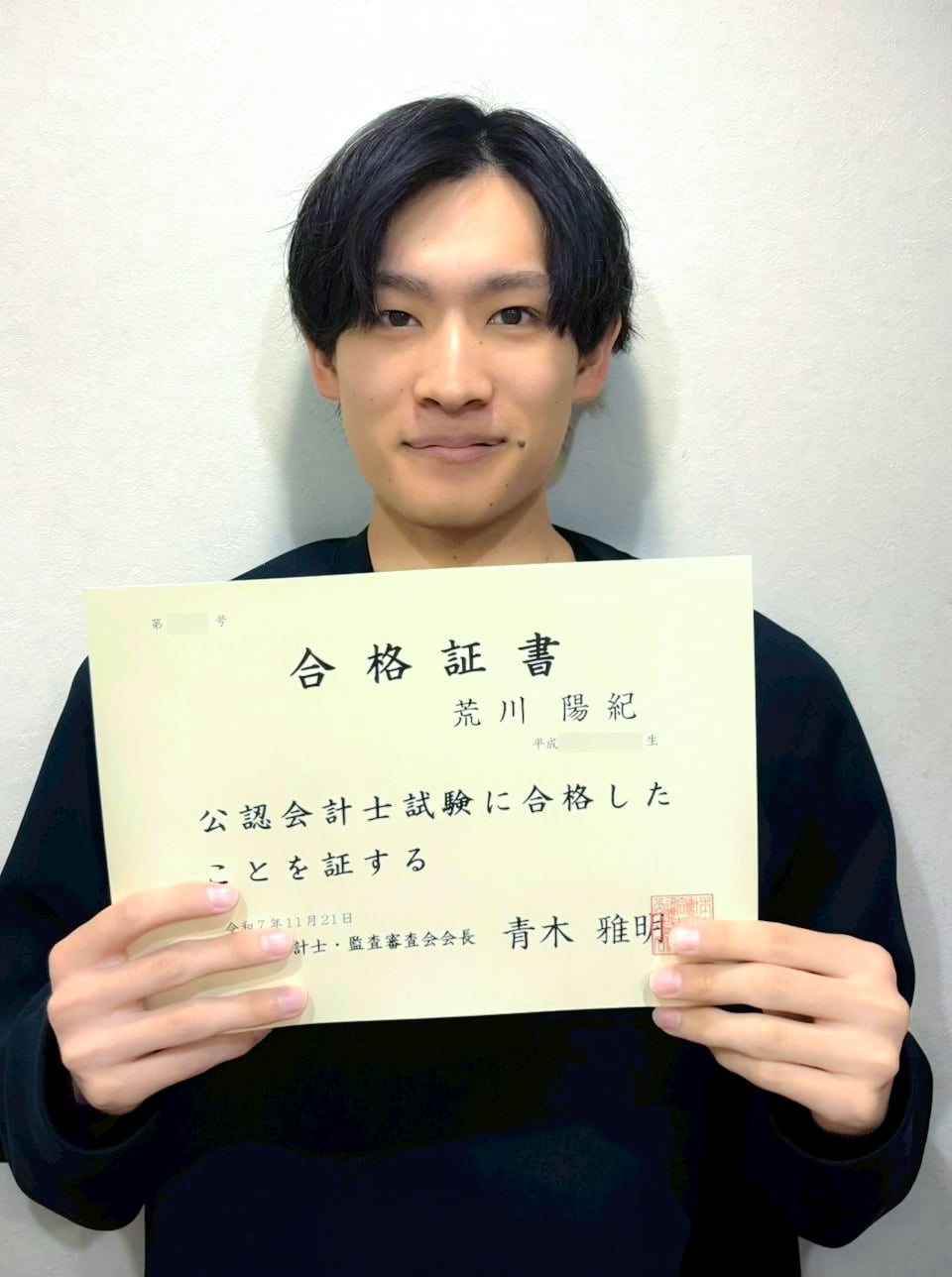 この度、大学1年生から努力してきた成果が実り、公認会計士試験に合格できたことを大変嬉しく思います。大学生活と公認会計士試験の勉強を両立することは容易ではありませんでしたが、最後までやり遂げられたことは、私自身にとって大きな財産になりました。