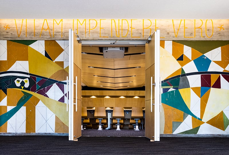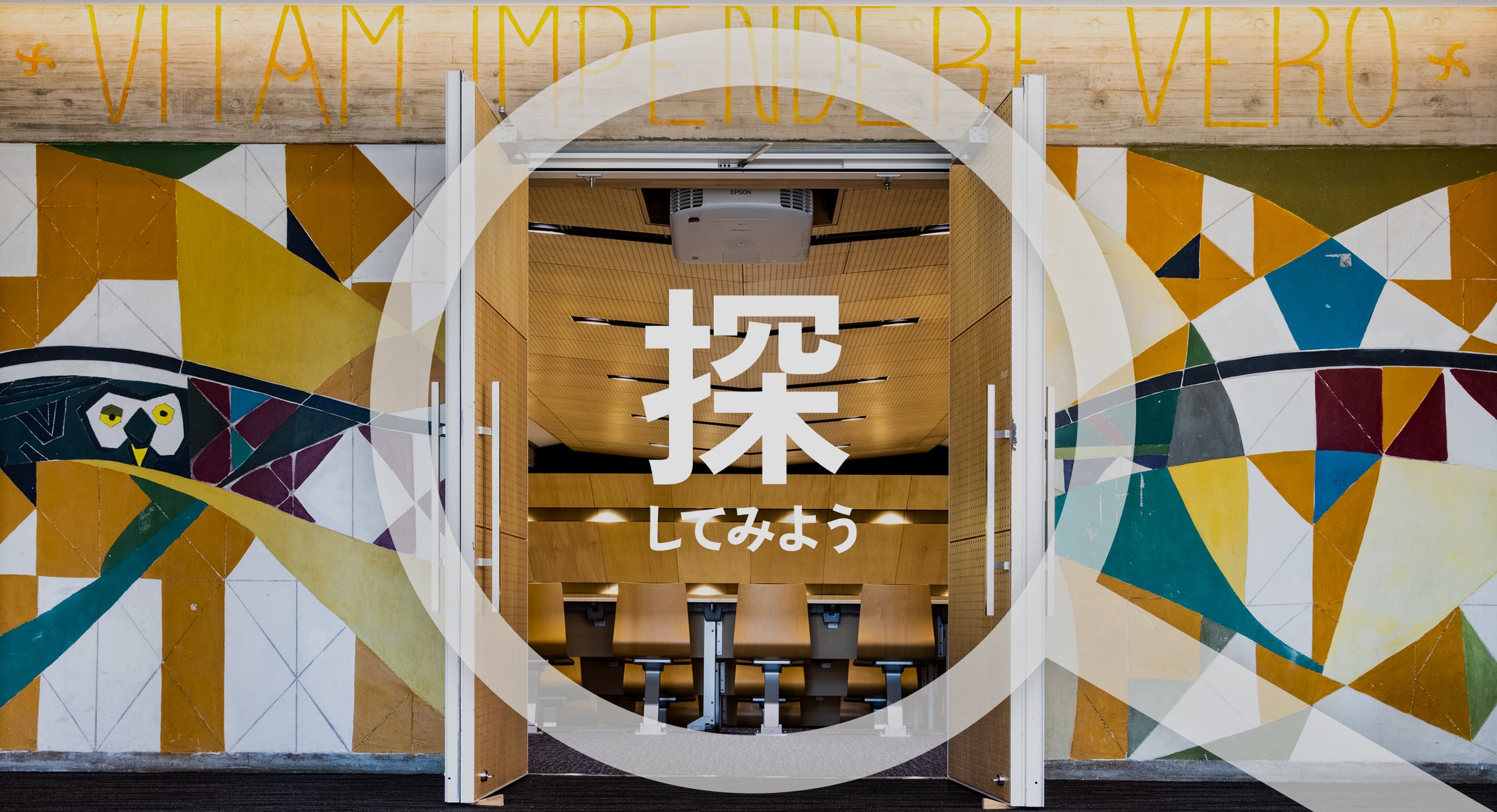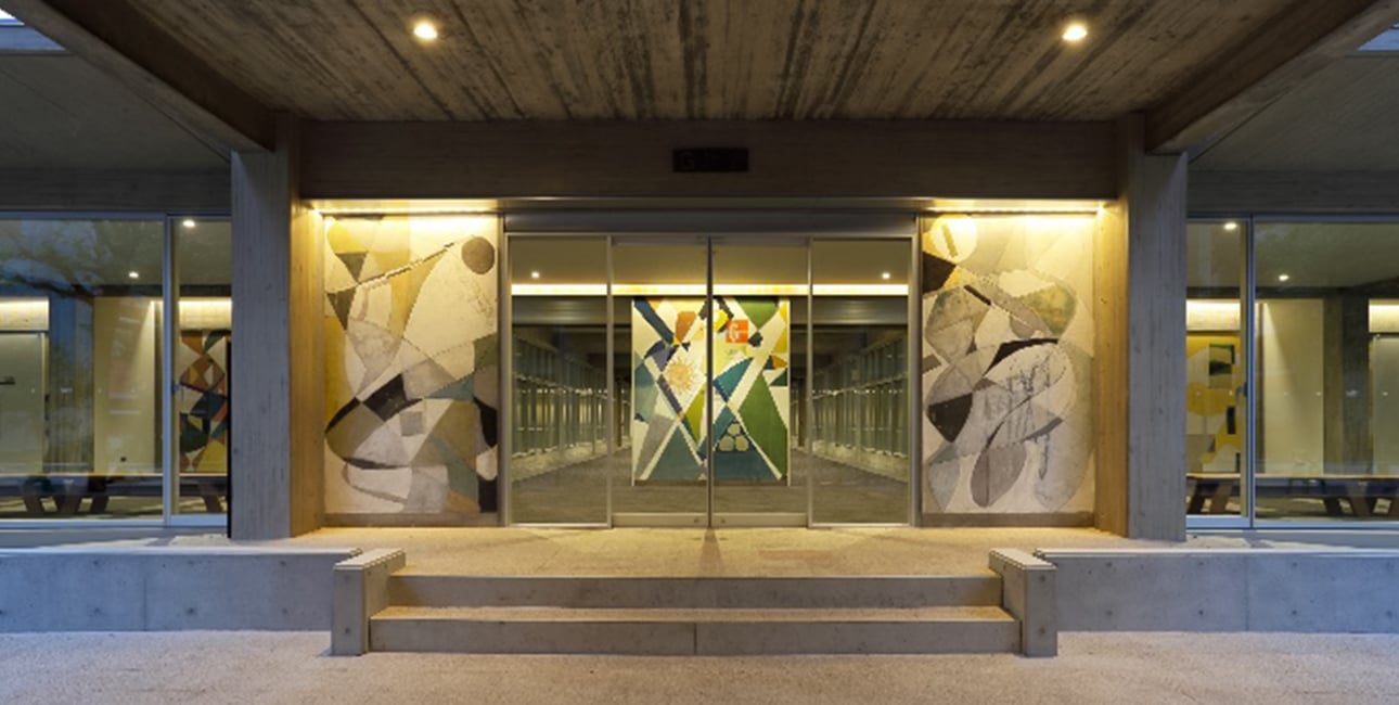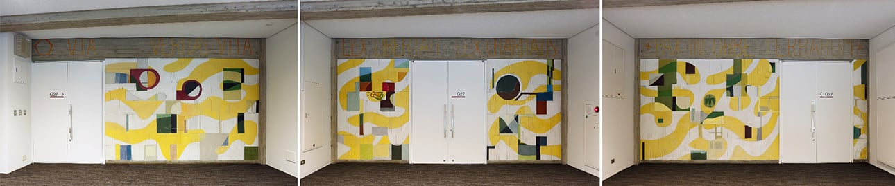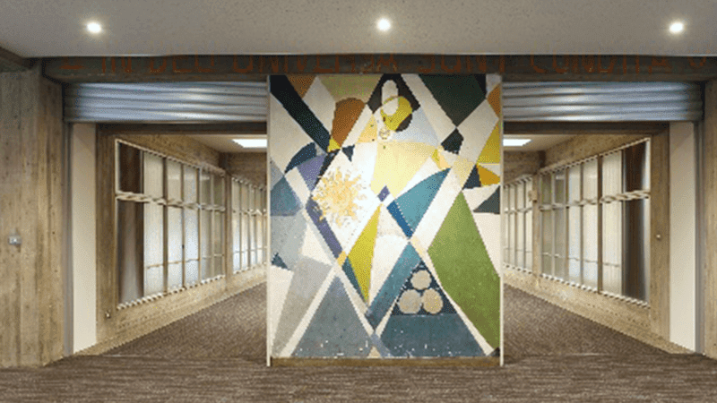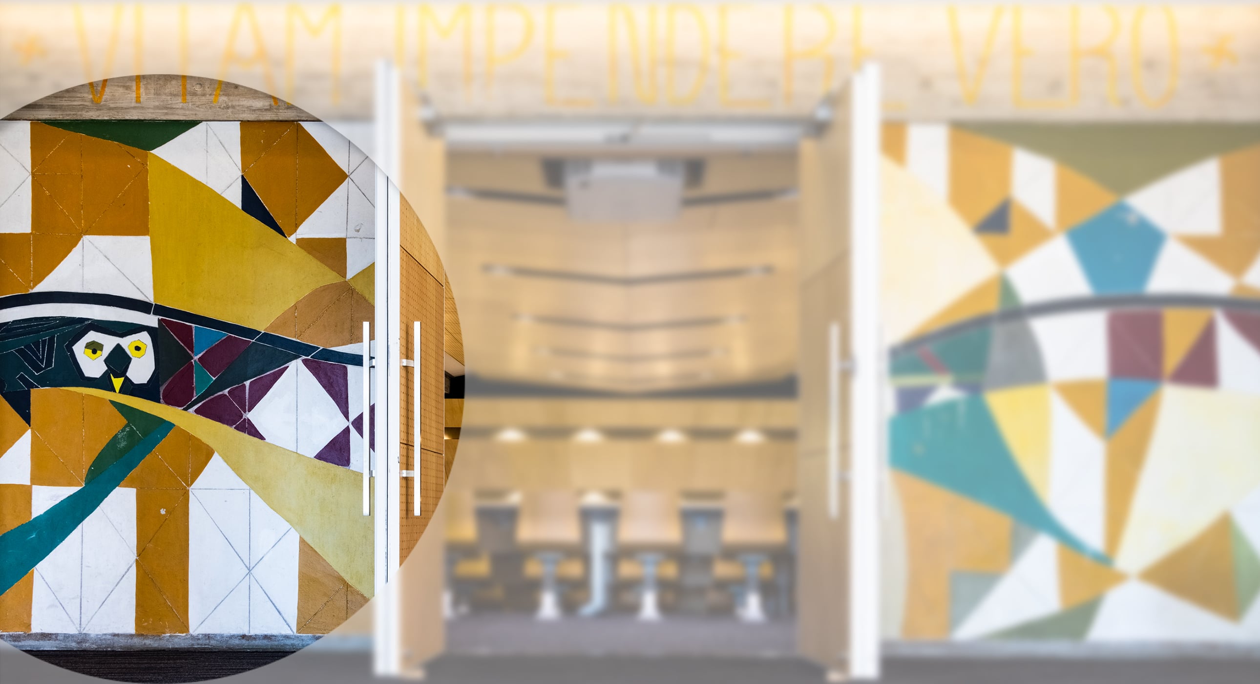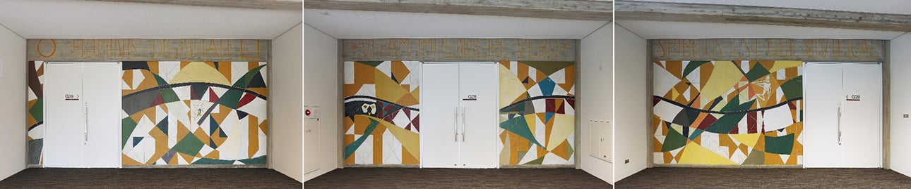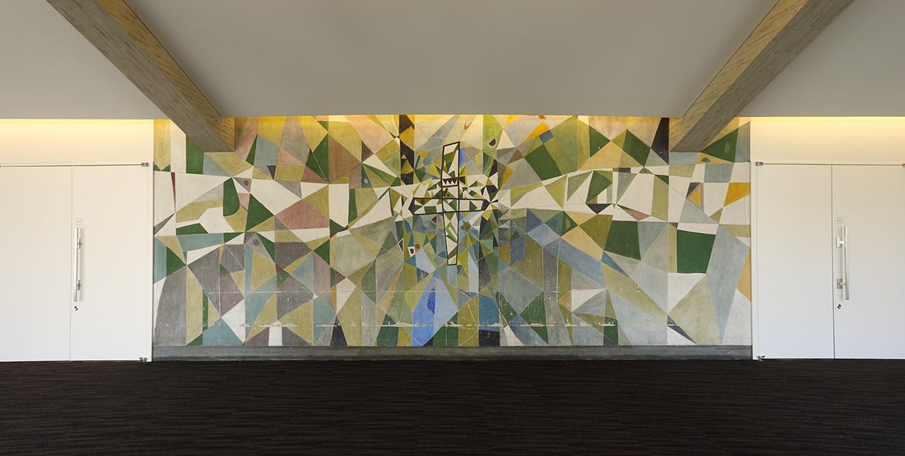 レーモンドのデザインによるフレスコ壁画は、メインストリートを挟んで、G30エントランスとG棟コリドーに描かれています。広場を囲むように大教室群の待合空間に壁画が描かれているのは、アートと建築が融合した南山大学特有の空間です。