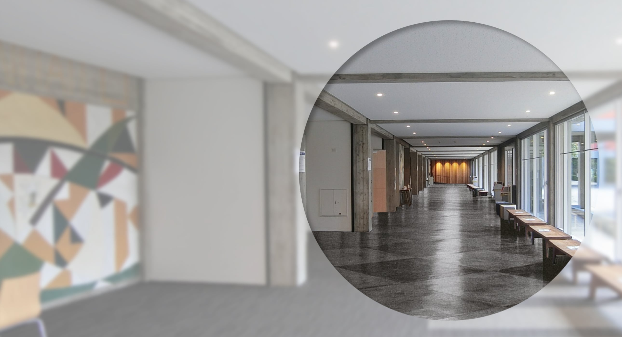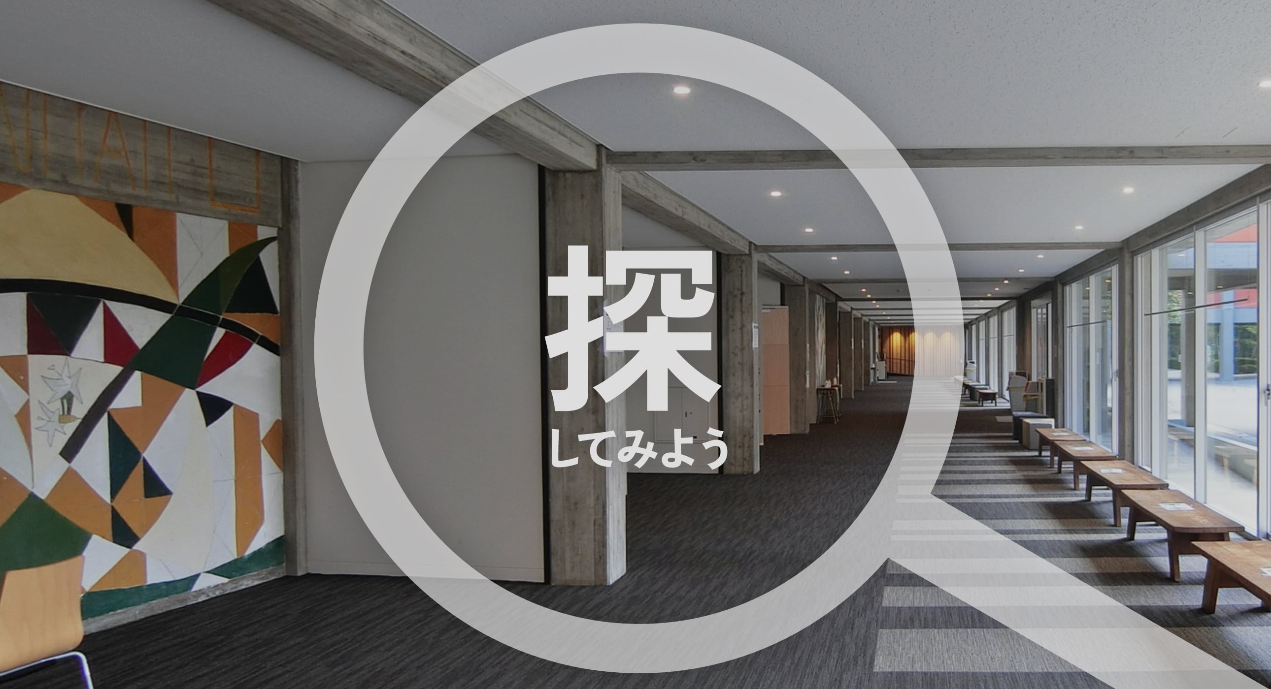 隠された床デザインはG棟地下1階の外部通路でみることができます。探してみてください。