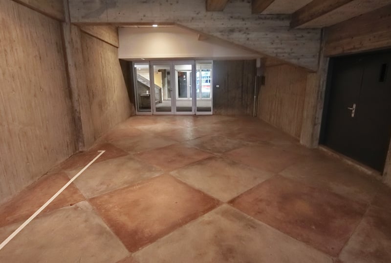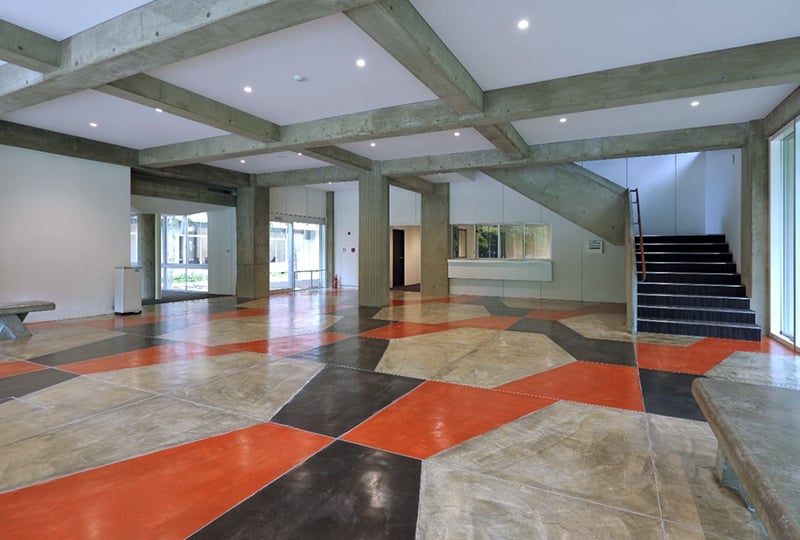 G棟の床はコンクリート躯体の上に、カラーハードセメントモルタルによる菱柄がデザインされていました。