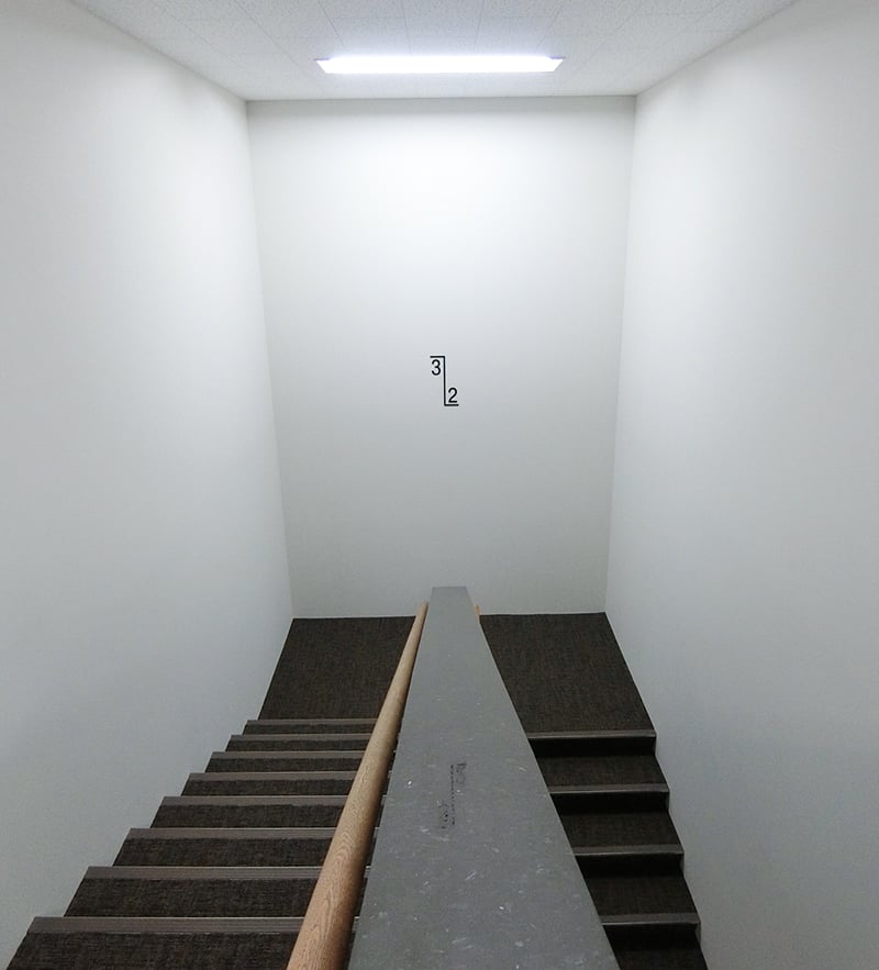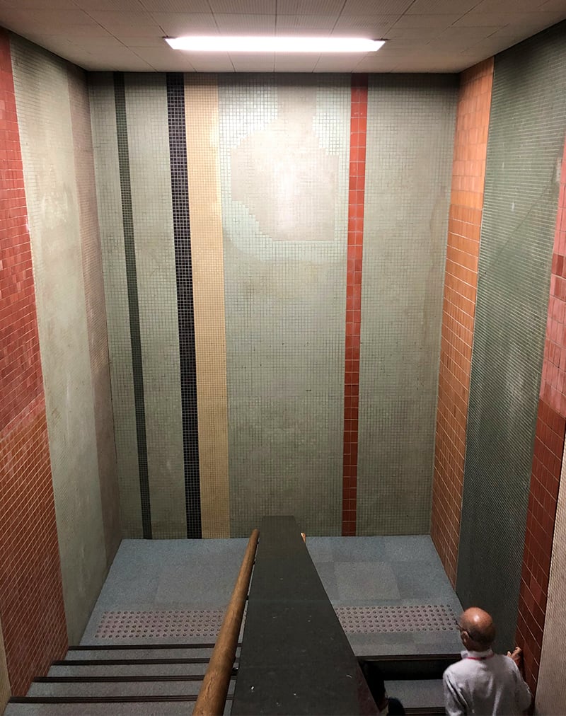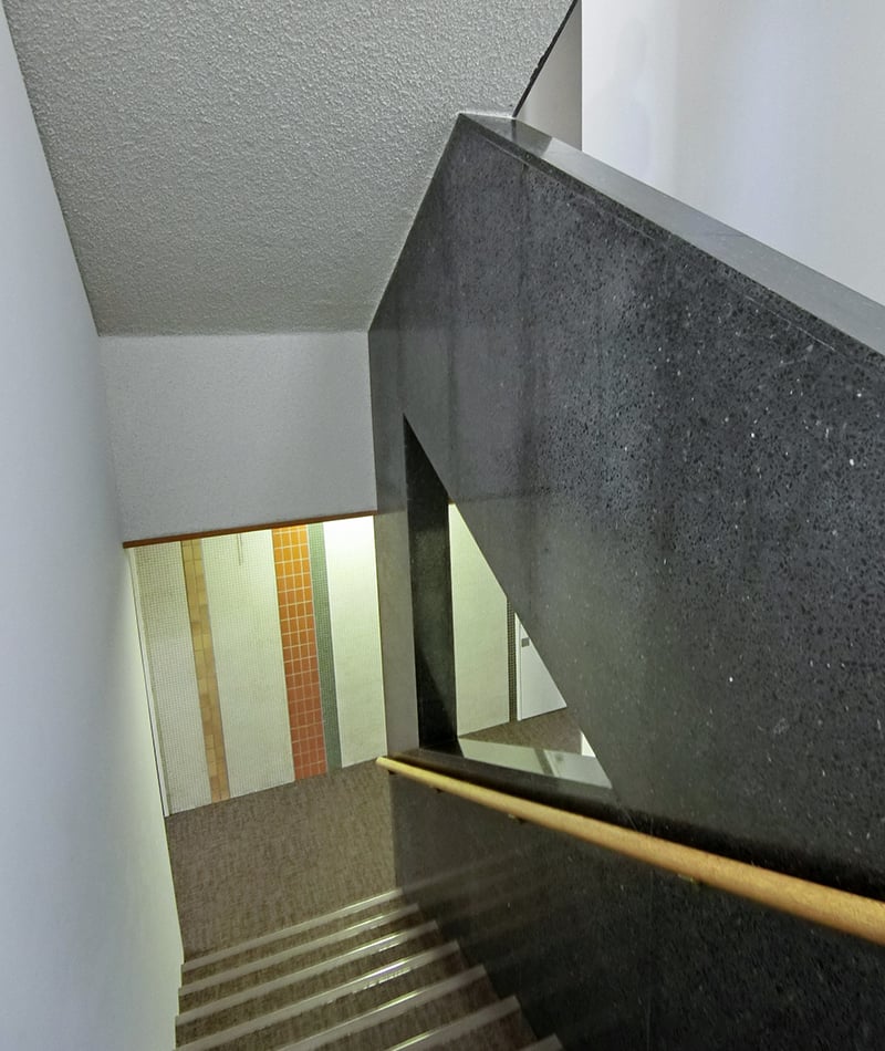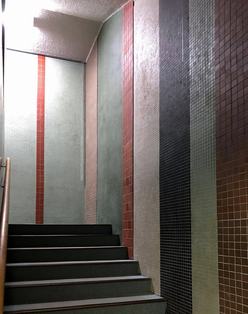 階段室のタイルは1964年のレーモンドの設計による創建時から残るもので、各階で異なるストライプ柄がデザインされ、特徴的な階段空間となっています。