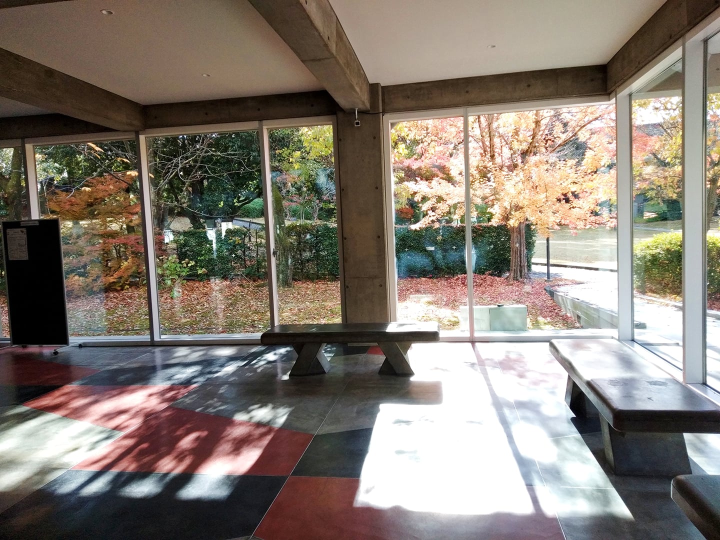 渡り廊下を歩きながらふと外を見ると、美しい対称をなした景色が現れ、まるで美術館建築のように見えました。
