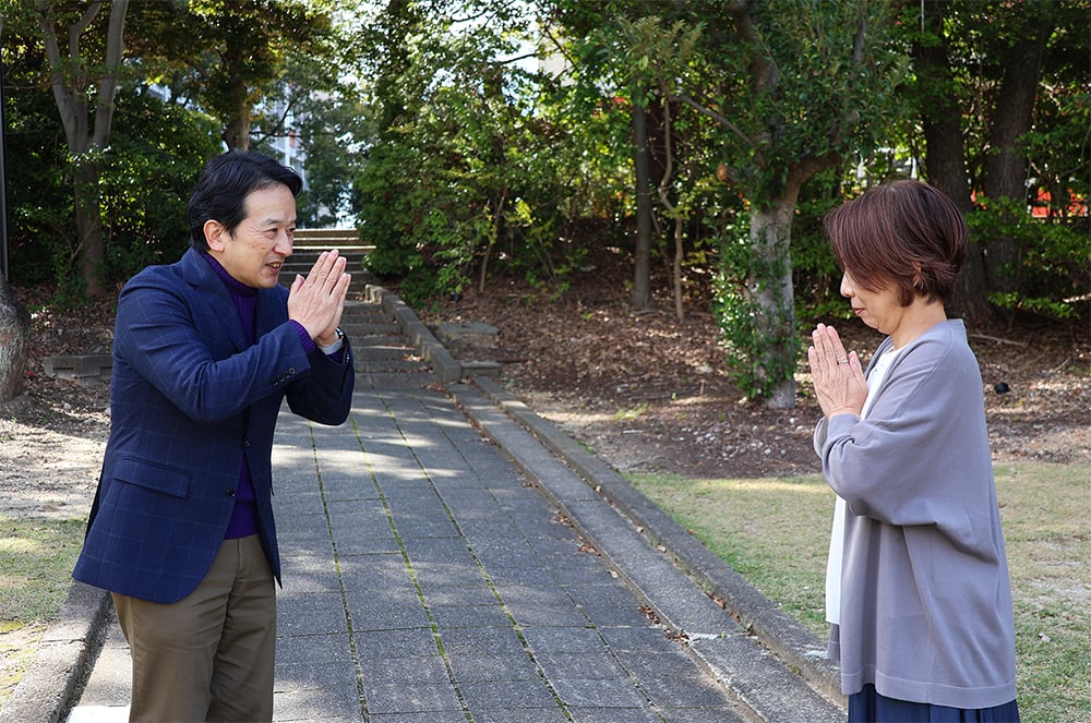 合掌礼を実演してくれました!友情出演:佐々木先生(先輩役)