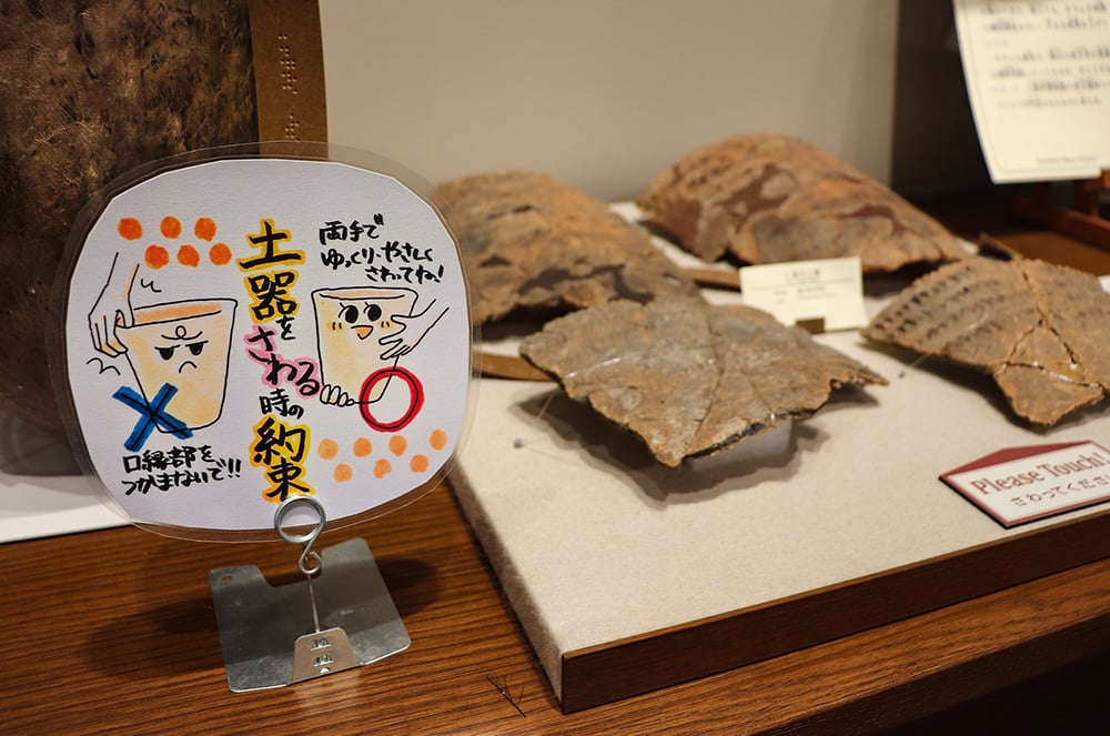 土器は、元々バラバラのものを接合して作られているので、その接合部分はどうしても弱くなってしまいます。わざとではなく、その部分にグッと力を入れて持ったら、完全にバラバラになってしまったことはありましたね。でも、そういったことは承知の上での展示ですので、そんな時は、その場ですぐに直します。