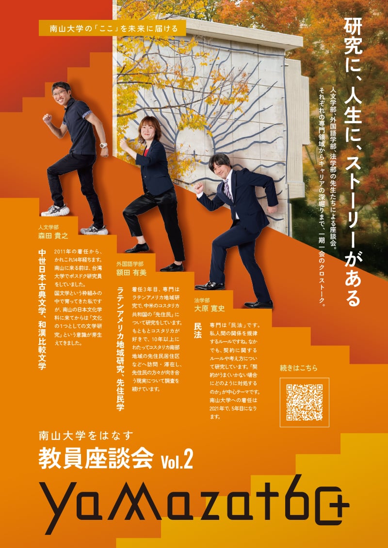 『YAMAZATO60+』教員座談会vol.2<前編>では、人文学部の森田先生、外国語学部の額田先生、法学部の大原先生の研究についてお聞きしました。ここからはメインテーマである、「Beautiful Campus」と「Nanzan Mind」について、そして未来に向けた話へと進めていきます。