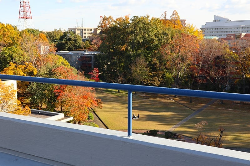 私にとって思い出の場所は、K棟の屋上です。今は屋上には上がれないですけど、私の学生時代は自由に行き来できたんですよ。K棟は高い建物ではないんだけど、ちょうどグリーンエリアを見渡せるので、そこで皆で弁当を食べたり、タバコを吸ったり、ぼーっとしたりしていました。